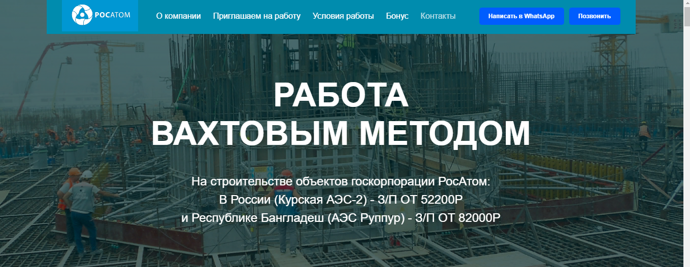 SEO и оптимизация: Лендинг оптимизирован под запросы («работа вахтой Росатом», «вахтовики вакансии»), настроены метатеги и alt-тексты.